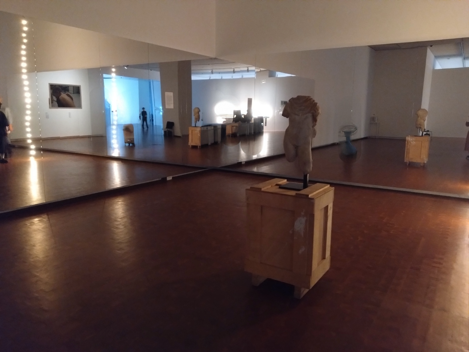 ヤン・ヴォ―は、ベトナムから難民としてデンマークに逃れた作家だ。彼は、社会の情勢を比喩的に作品に落とし込んできた。この作品では、メディウムの多様性が生み出す効果を感じ取れる。鏡のうち一つはアクリル画であり、物質の境界を曖昧にさせる。彼のミューズである、甥のグスタフの写った写真と、1世紀の大理石像のイメージは重ね合わさって、理想の肉体の存在を、時代を超えて示す。様々な素材が共鳴する空間内を、鑑賞者は自由に歩くことができる。鏡に映った自分の存在もまた、作品のなかに融合していく感覚を味わえる。